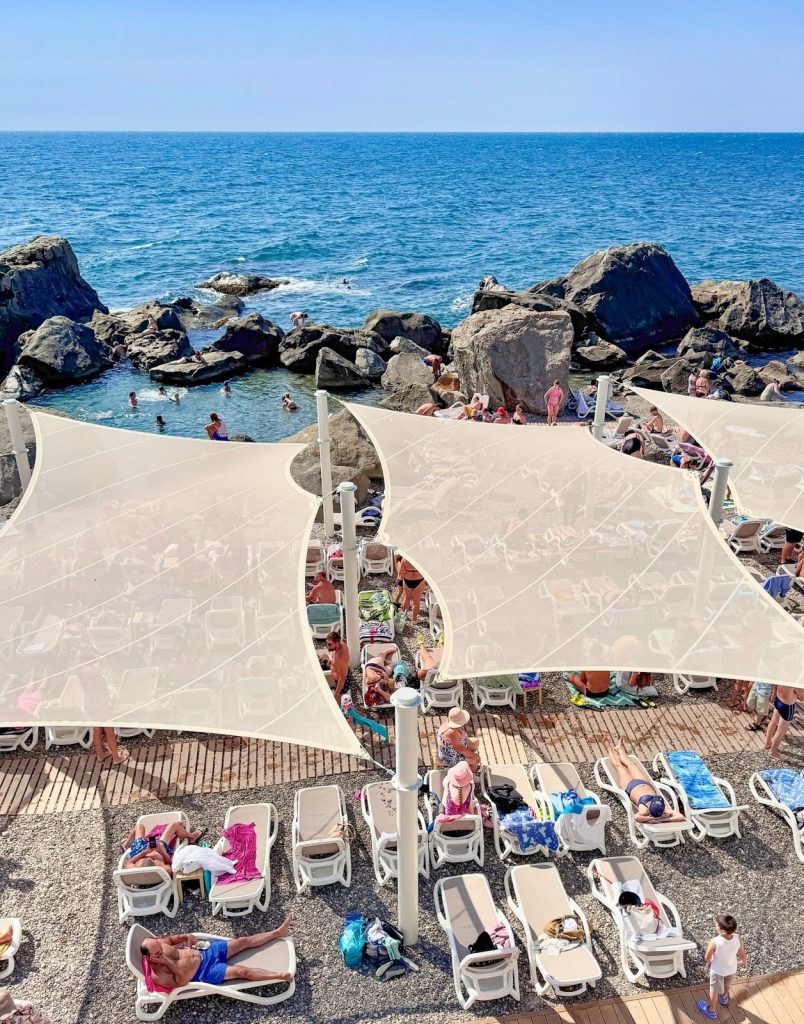 Летом 2025 года в Алупке завершилась масштабная реконструкция Детского пляжа, ставшая настоящим подарком для семейного отдыха. Пляж расположен прямо под Воронцовским парком, в небольшой защищённой бухте, огороженной массивными валунами. Благодаря скальным образованиям здесь образовались естественные мелководные «ванны», где глубина не превышает метра — идеальное место для самых маленьких купальщиков. После реконструкции обновлены берегоукрепительные сооружения, на бунах установлены металлические лестницы для спуска в море, построены раздевалки и душевые кабины, проведено современное освещение, организованы прогулочные зоны. Для отдыха на солнце установлено 120 бесплатных шезлонгов и обустроена просторная теневая зона. На территории также появились камеры хранения, медпункт и семейное кафе с панорамным видом на море. Рядом с пляжем располагается возрождённая лодочная станция «Порт Жорж» — отсылка к исторической рыбацкой артели XIX века.