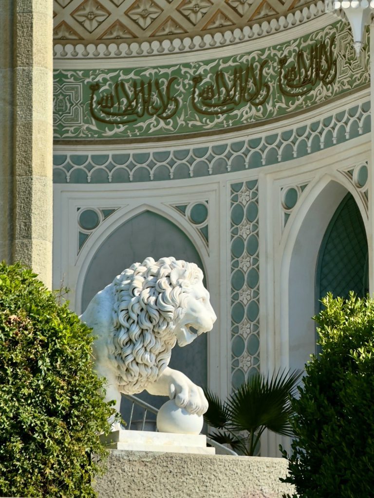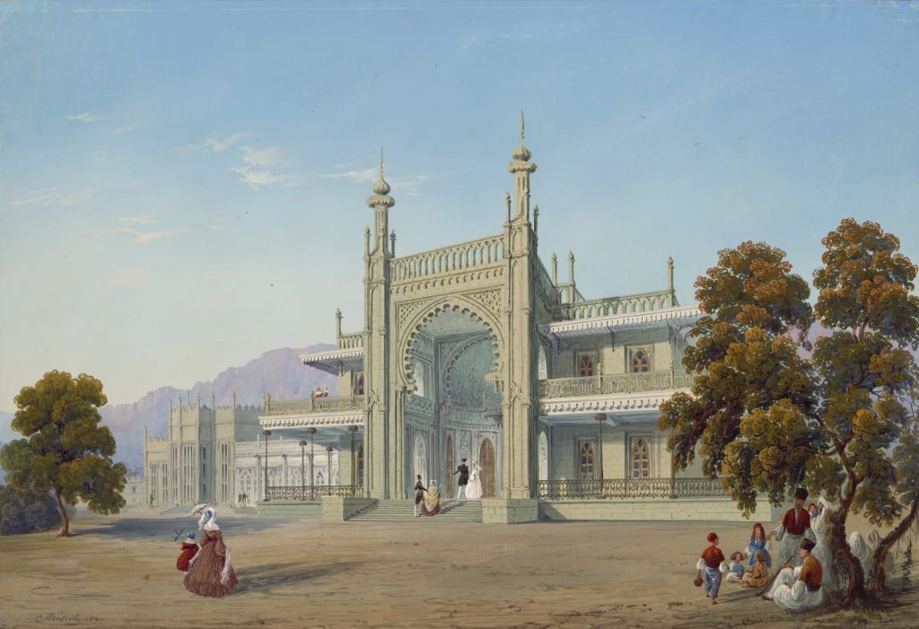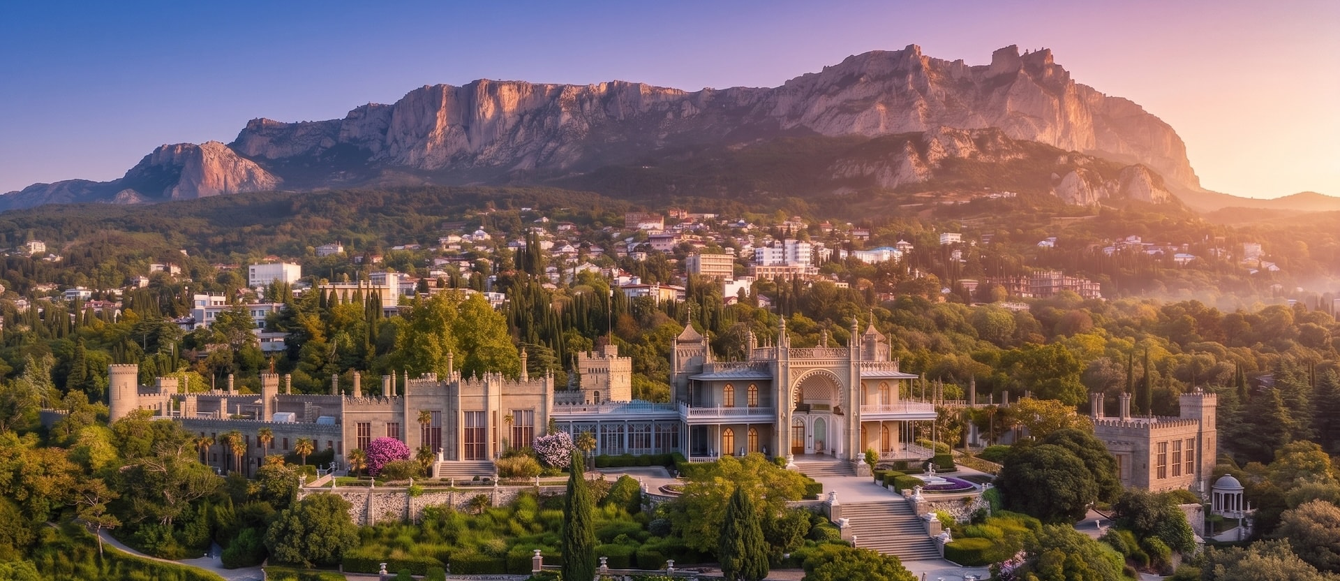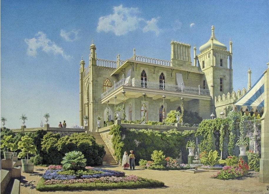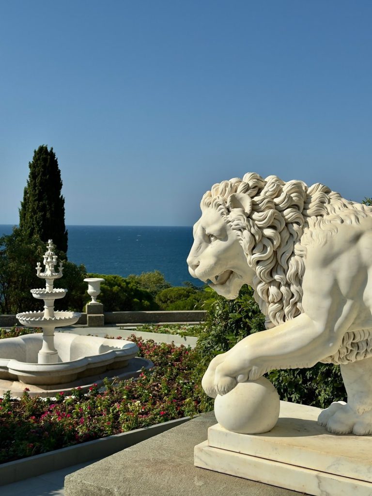 Главная жемчужина Алупки — Воронцовский дворец, возведённый в 1828–1848 годах по проекту английского архитектора Эдварда Блора. Дворец поражает своей эклектикой: северный фасад выполнен в духе английской неоготики, тогда как южный, обращённый к морю, выдержан в мавританском стиле с изящными арками и резными надписями из Корана. Перед южным входом застыли знаменитые мраморные львы работы итальянского скульптора Джованни Боннани.